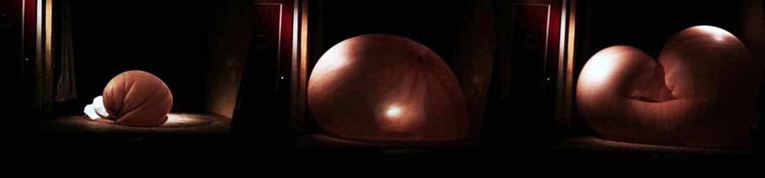 Über drei Abende experimentierten Nicole David, Loris Ciresa und ich auf der fünf Quadratmeter grossen Kulturbühne in der Loge Luzern für das "Adventstürchen 2013". Die Idee, mit dem Meteoballon zu arbeiten, überzeugte uns alle drei, da er sich mit dem Volumen der Loge in einen spannungsgeladenen, räumlichen Dialog setzen liess. Persönlich hat es mich gefreut, dieses Material in einem neuen Kontext auszuprobieren, habe ich es doch über mein AIL Stipendium an der Hochschule in Zürich im WSL Institut in Bellinzona kennengelernt, und bei INANNA als Bühnenelement weiterverwendet.